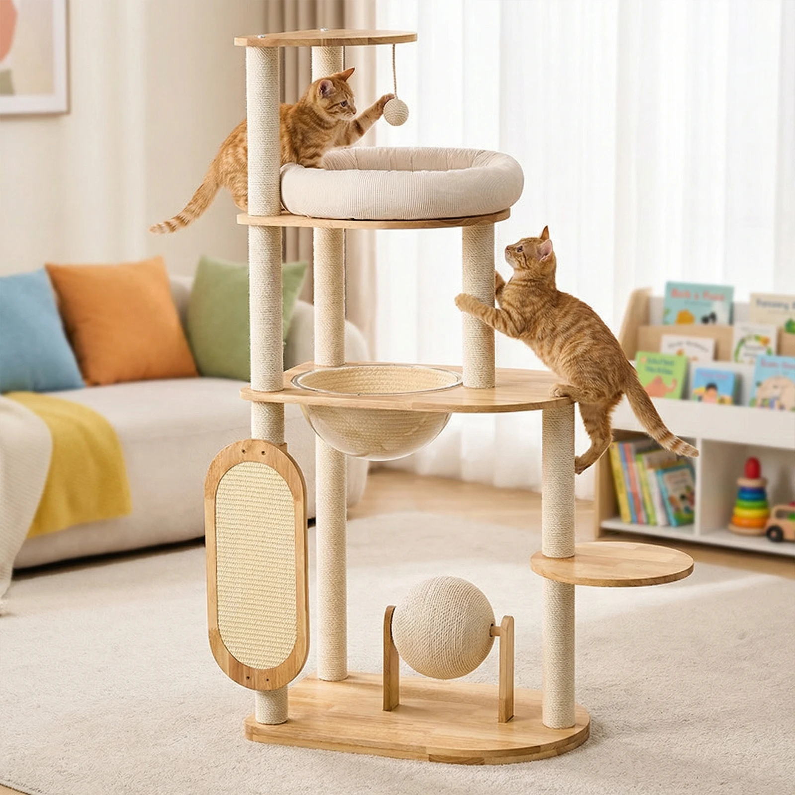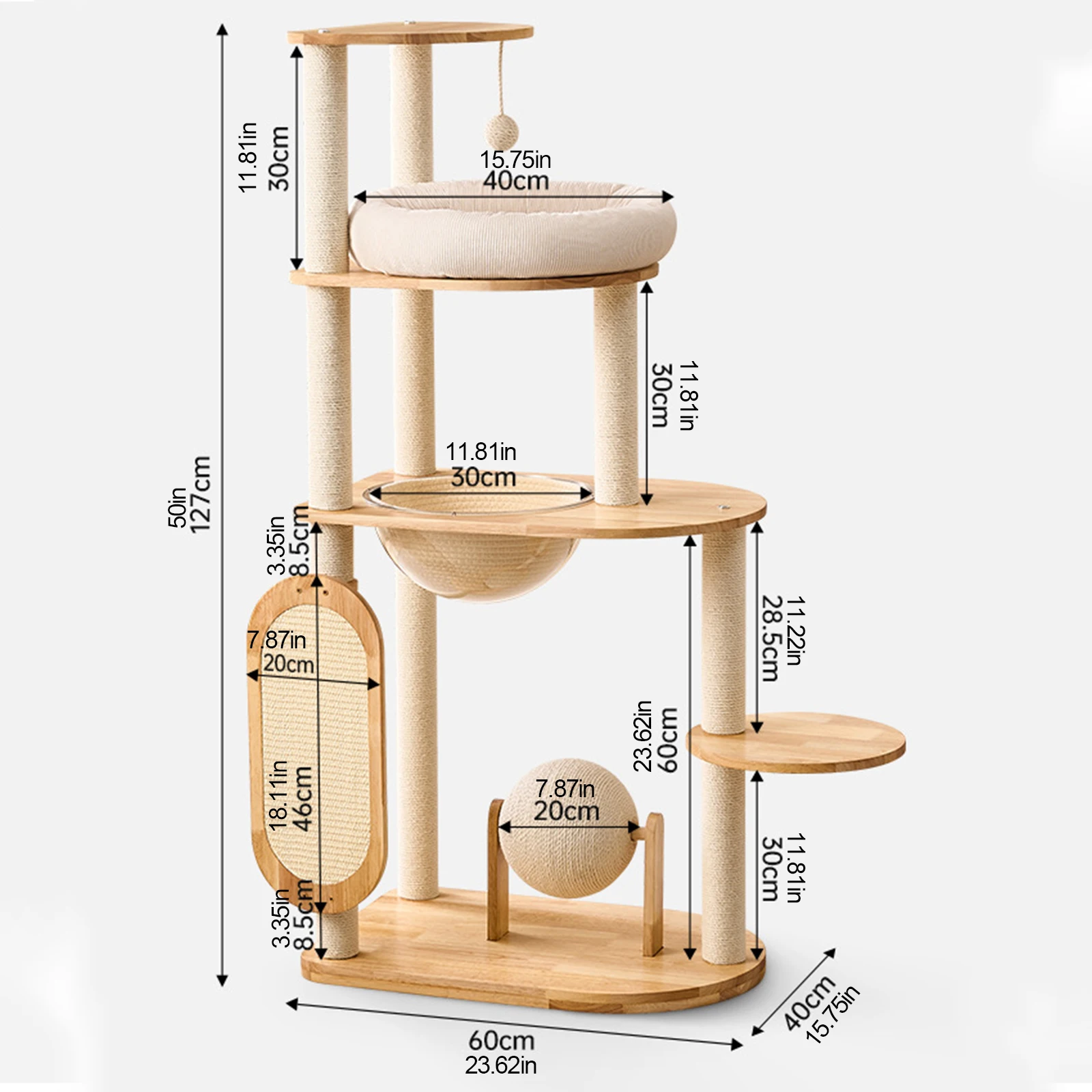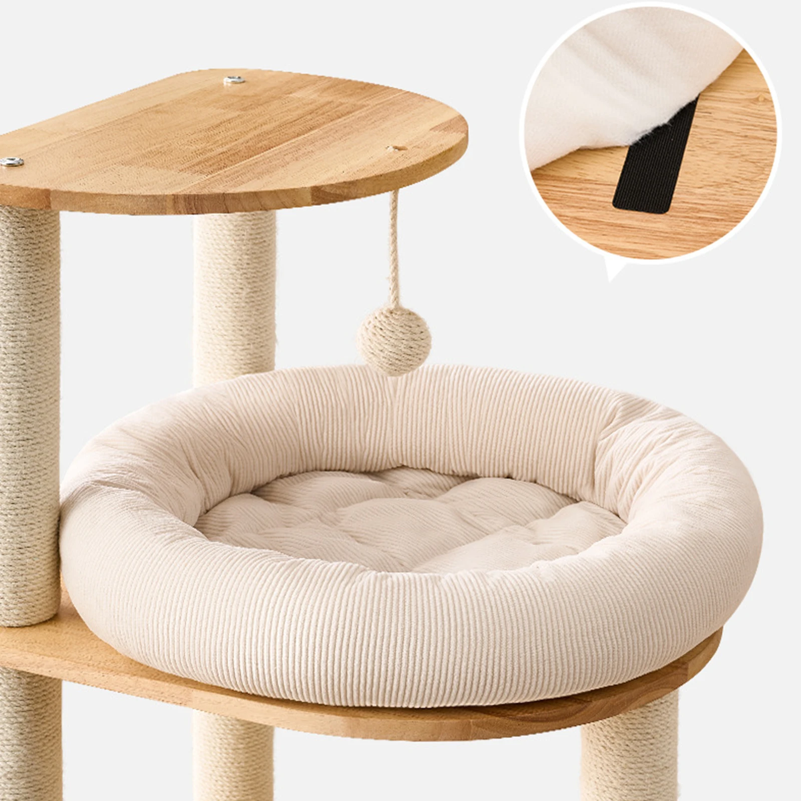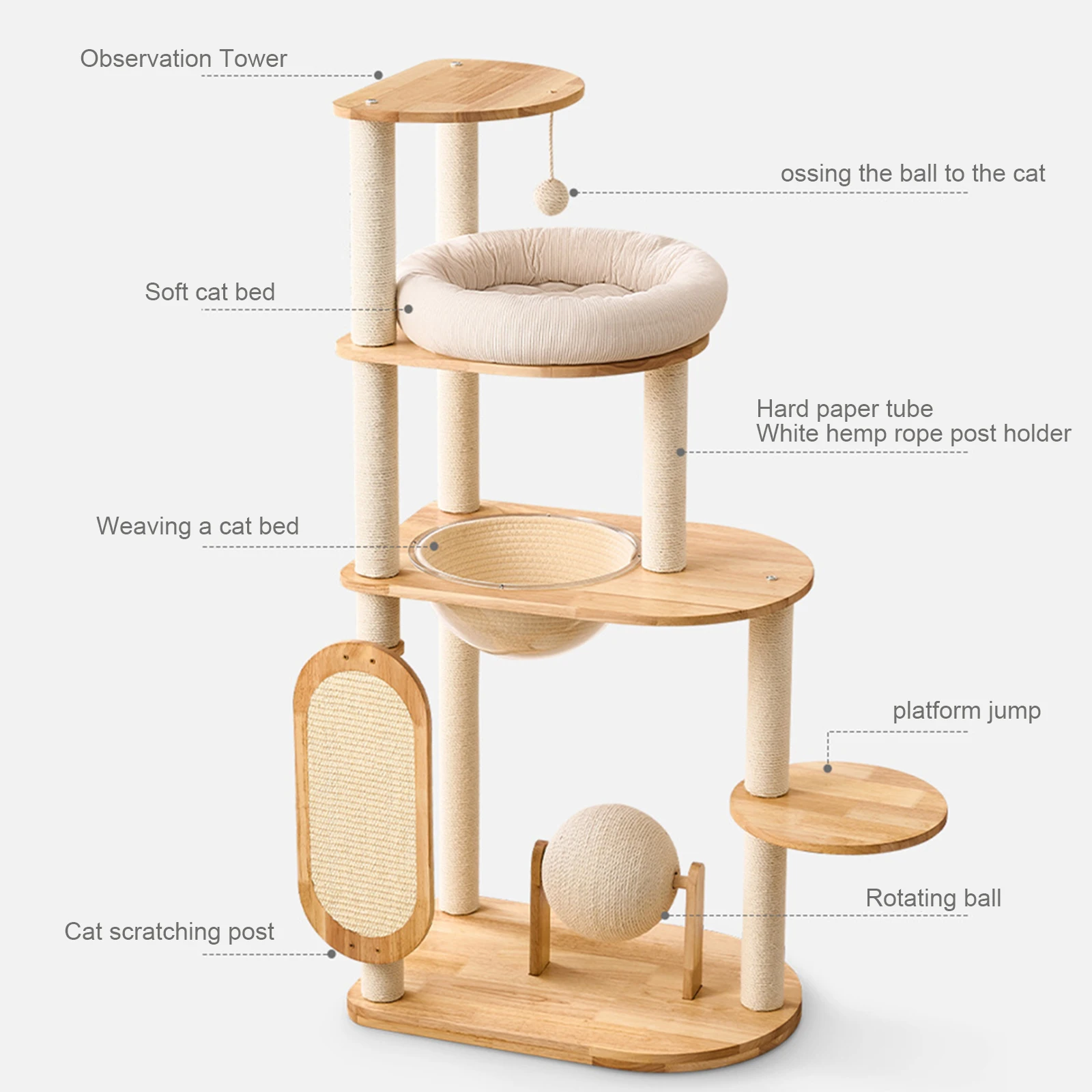Solid Rubber Wood Cute Climb Frame Beds with Scratching Posts Cat Scratching Ball and Board Washable Easy Clean for Large & Multi-Cat Homes