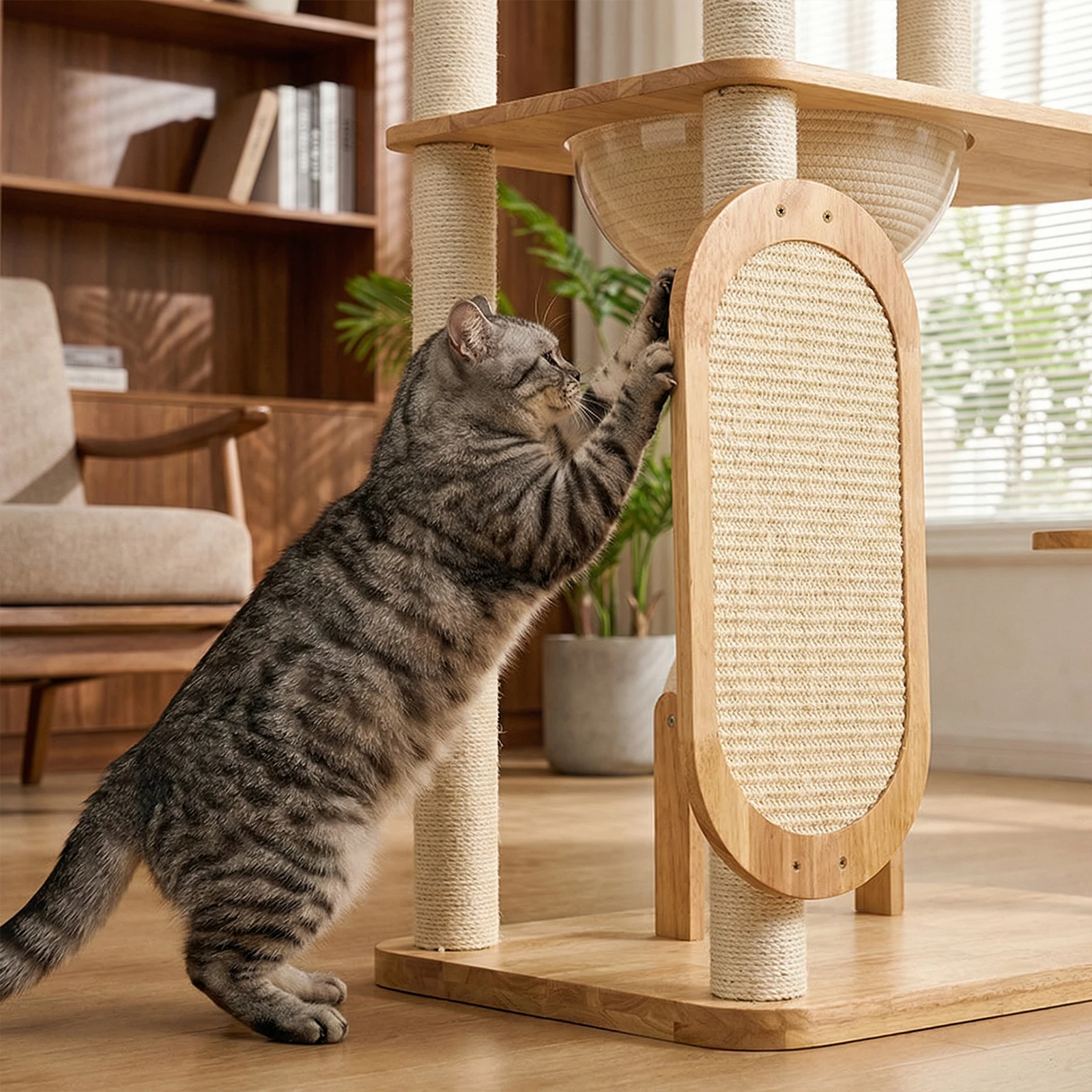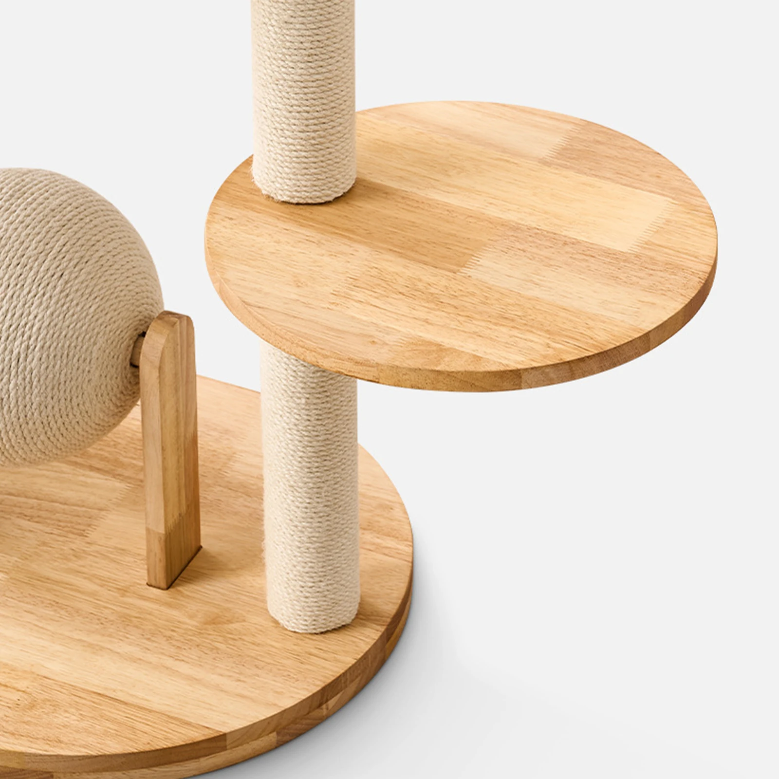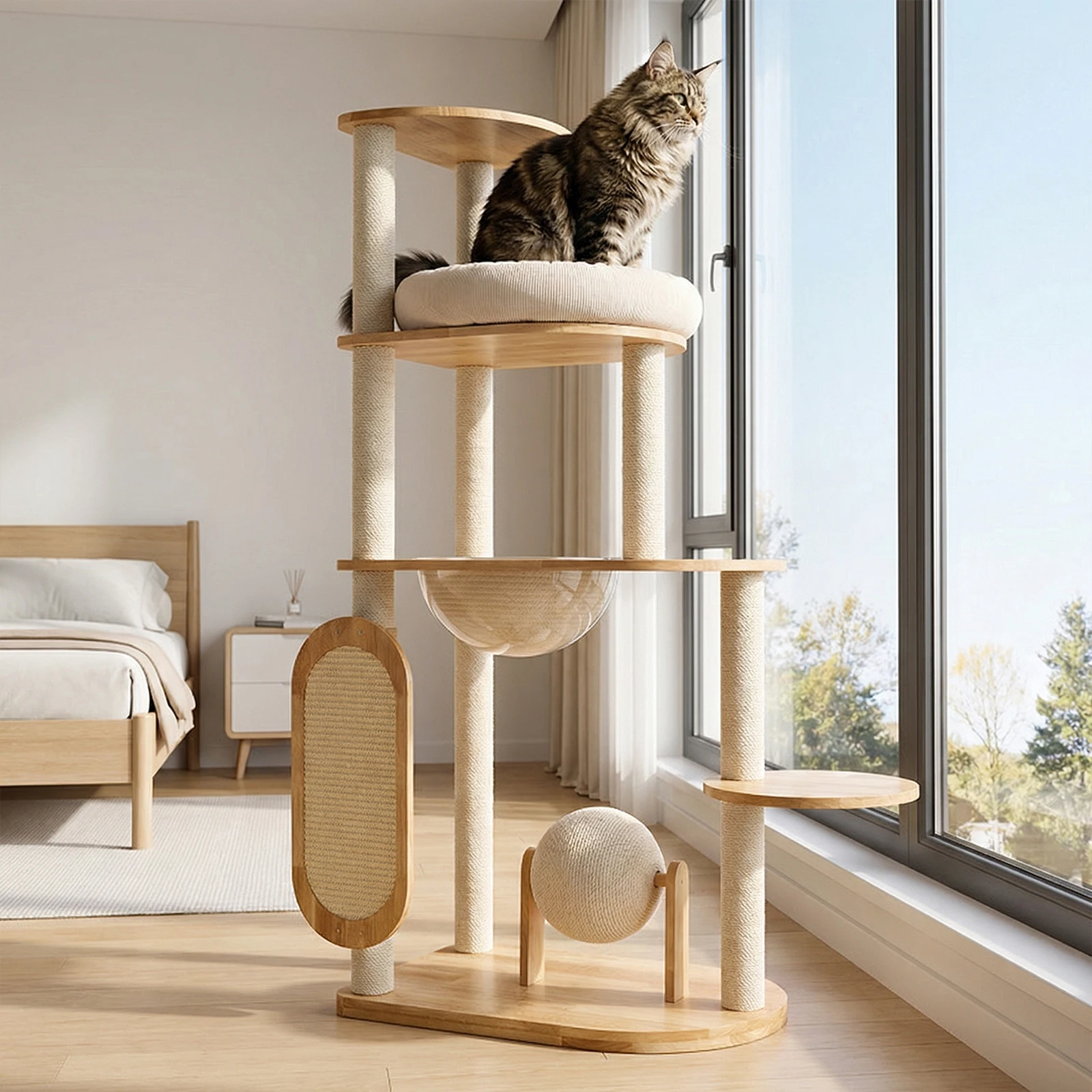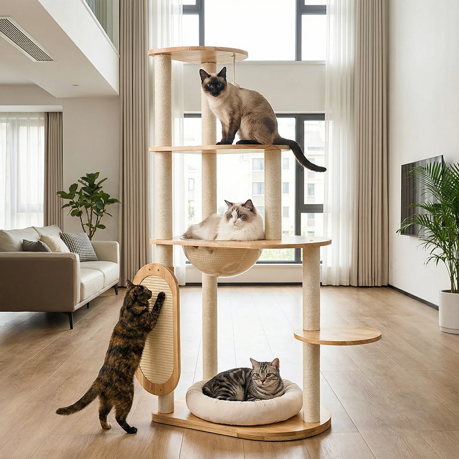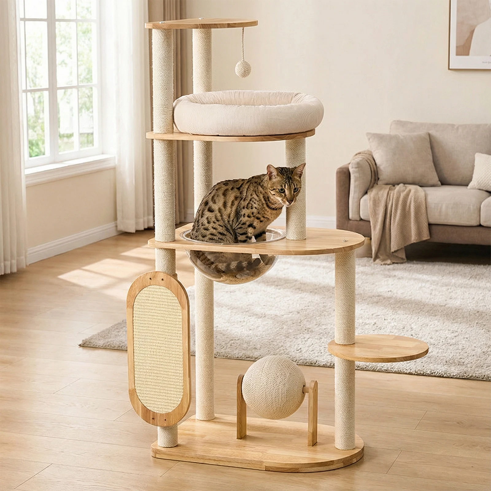 Solid Rubber Wood Cute Climb Frame Beds with Scratching Posts Cat Scratching Ball and Board Washable Easy Clean for Large & Multi-Cat Homes