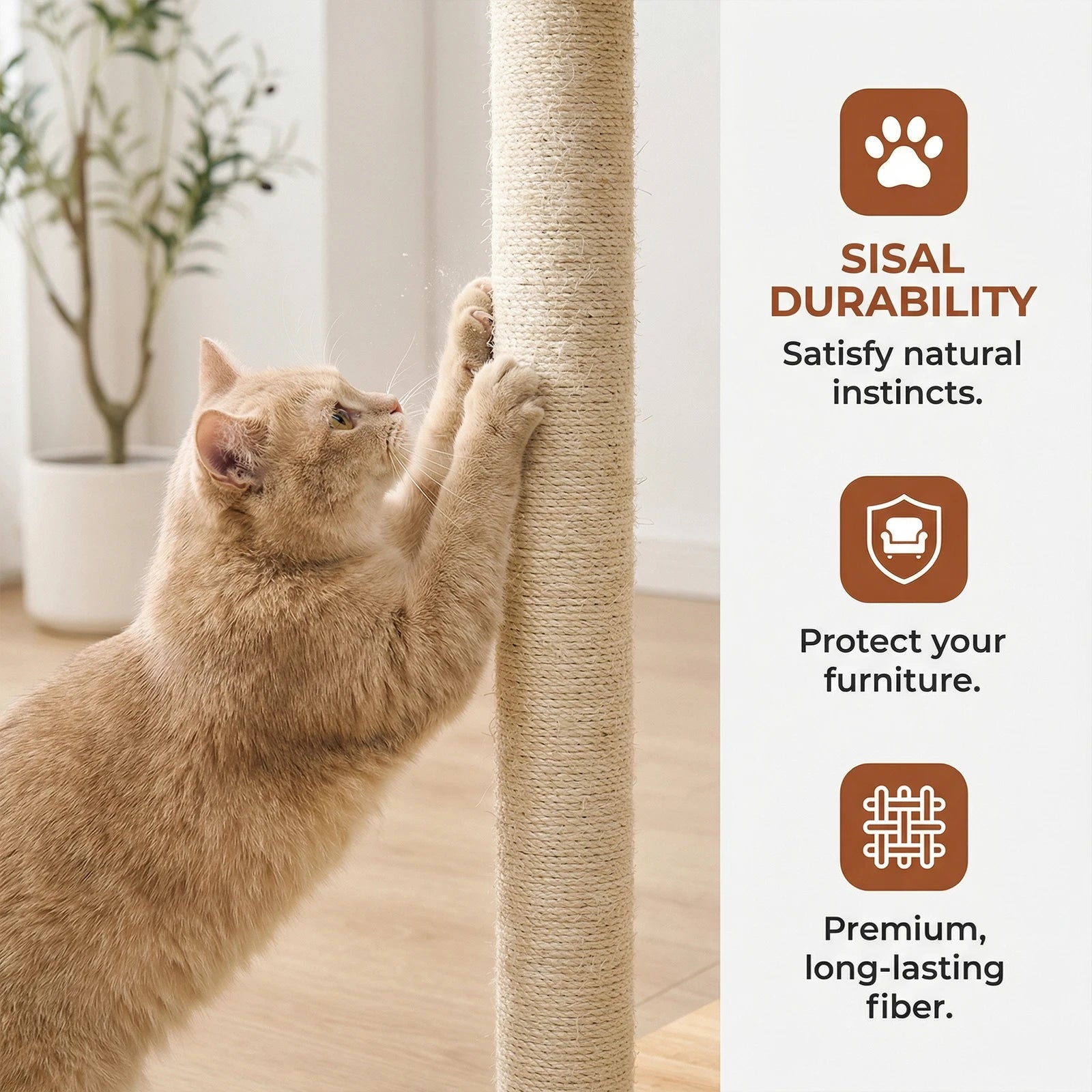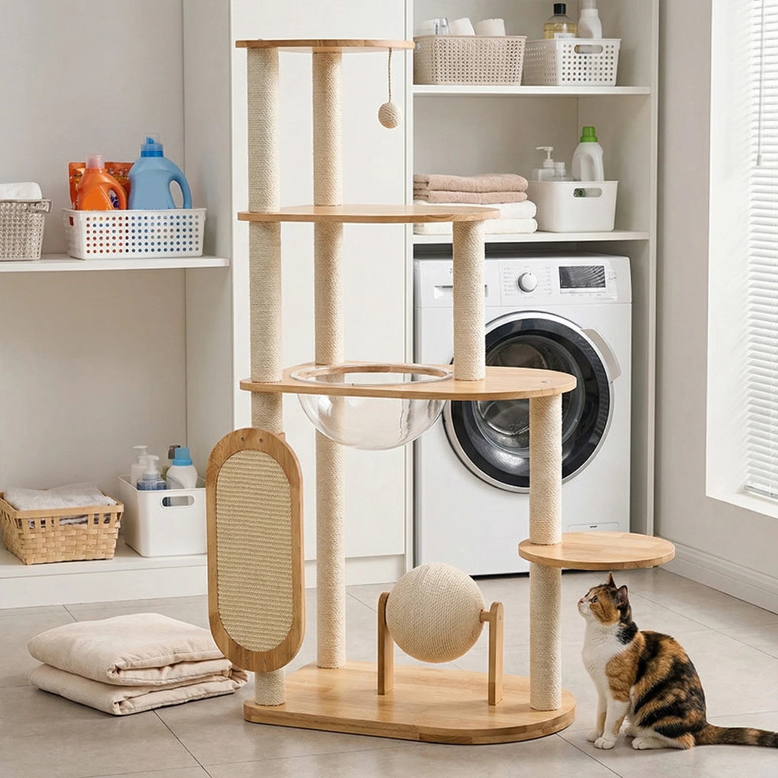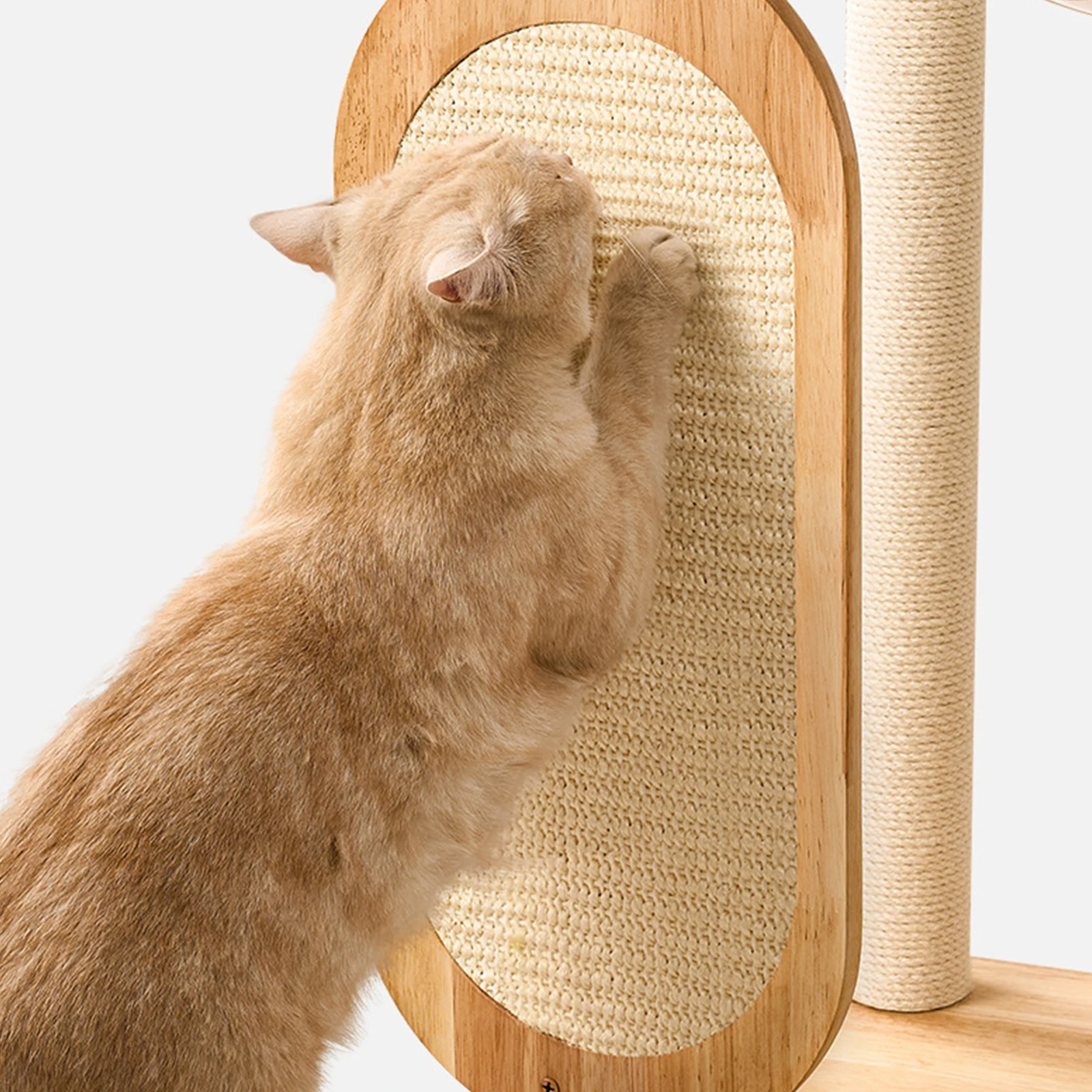Features: 1.Stepwise Design & Multi-Layer Functionality: This modern cat tree features a stepwise structure tailored for large cats, enhancing climbing and playtime fun. Equipped with spacious removable washable mats, cozy cat beds, platforms, and enduring scratching posts, it is the cat tree tower for your pet. 2.Quick & Easy Assembly: With intuitive illustrated instructions, you can effortlessly build this sturdy cat climbing frame. All tools and clearly marked parts are included, allowing you to complete assembly in minutes and instantly provide a secure cat jumping platform. 3.Natural Material & Easy Maintenance: Made from premium natural rubber wood, this large cute climb frame beds offers stability and a surface that's simple to wipe clean. The detachable cotton mats are machine-washable for convenient hygiene. 4.Sturdy Structure for Large & Multiple Cats: Reinforced baseboard construction safely supports 3-5 cats at once. Interactive toys promote exercise and bonding, making this modern cat tree superb for homes with big cats or multiple feline companions. 5.Lifetime Support Guarantee: Contact us anytime for assistance with assembly or product concerns. We respond quickly to keep your cat tree tower as your pets' favorite spot for years to come! Specification: Origin: Mainland China Product material: rubber wood + white sisal Product Suitability: Cats of all ages Product size: about 60*40*127cm (bottom length*width*overall product height)