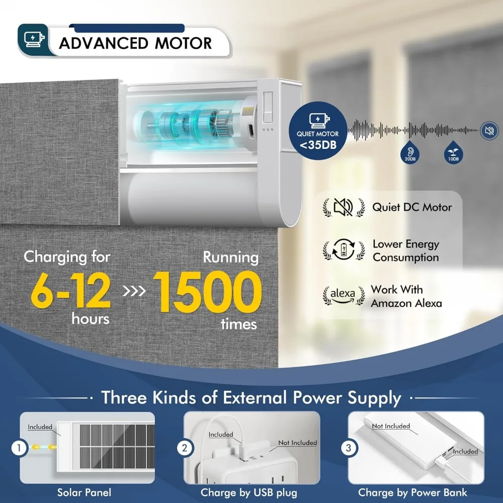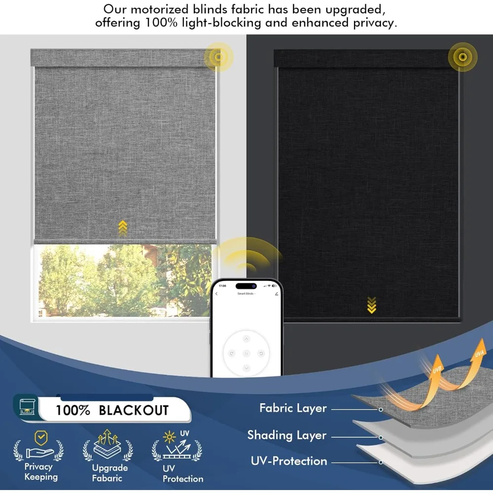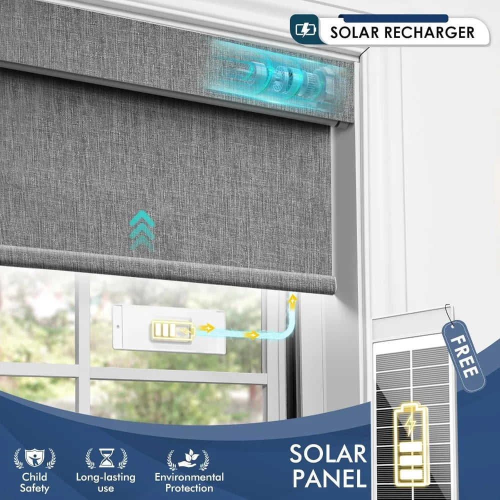 Smart Motorized Blinds for 100% Blackout, Rechargeable with Solar Panel, Wireless Electric Roller Shades for Home Automation
